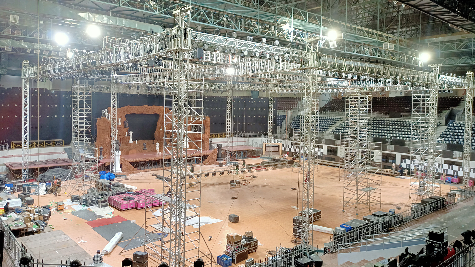 The build itself used a gigantic 39m x 30m x 13m MILOS ground support truss constructed from M950 truss and MT3 towers. From this ground supported truss approximately 8500 kgs of load was suspended which consisted of intelligent and static lighting fixtures such as 375 LED pars, 50 LED washes, and 48 Pointes, a bright, super-fast parallel beam that cuts through the air and across video with ease,