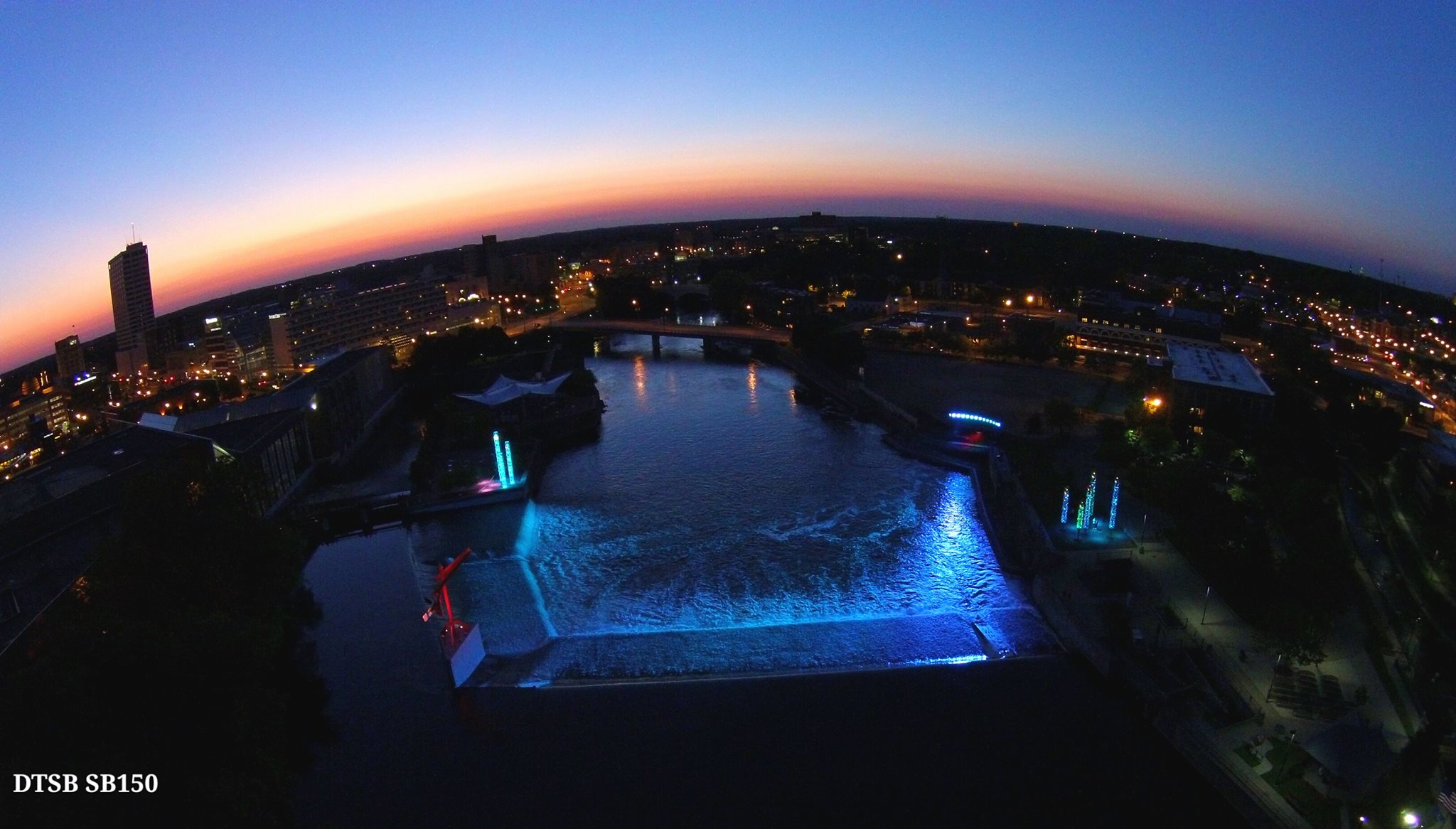 The unique, interactive lighting display is made up of five components: The Jefferson St. bridge, the “Keepers of the fire” sculpture, the downstream crescent that lights up the cascades, the trio sculpture on Century City Island, and the Forest Towers directly across the river at Seitz Park.